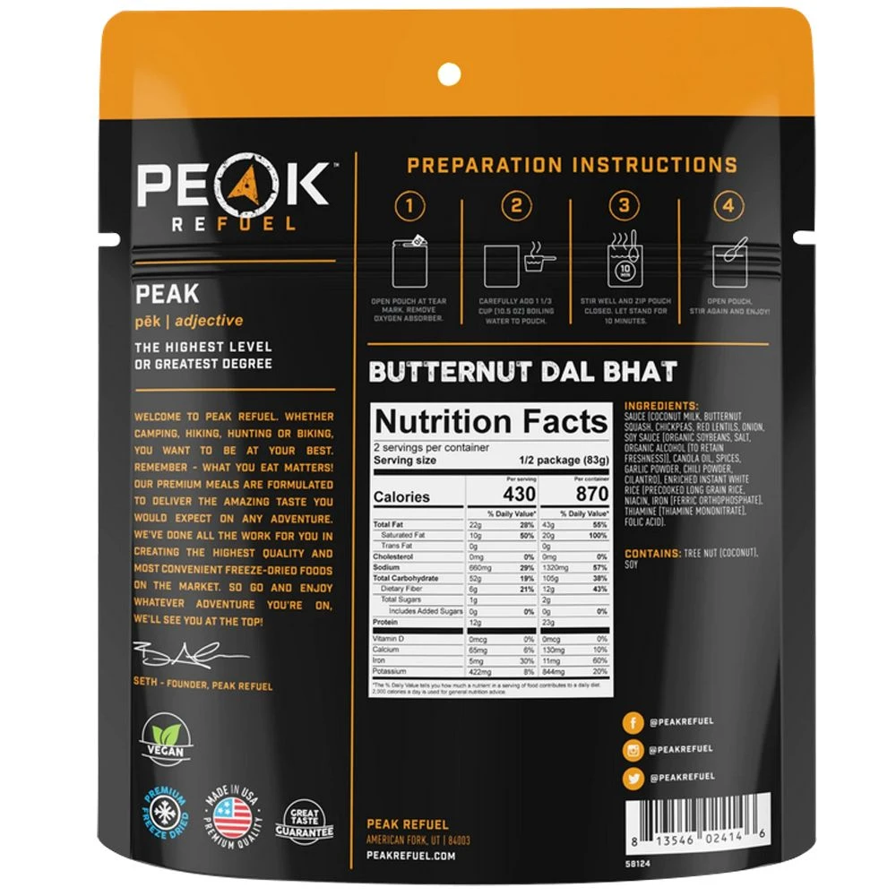 Whether you’re stopping for lunch on the trail or getting ready for dinner at your campsite, we guarantee you’ll want some Butternut Dal Bhat in your pack. With red lentils, chickpeas, rice, and butternut squash, this delicious dish will blow your mind! Oh, and did we mention it’s vegan? Just add 1 1/3 cups of boiling water and you’re set!